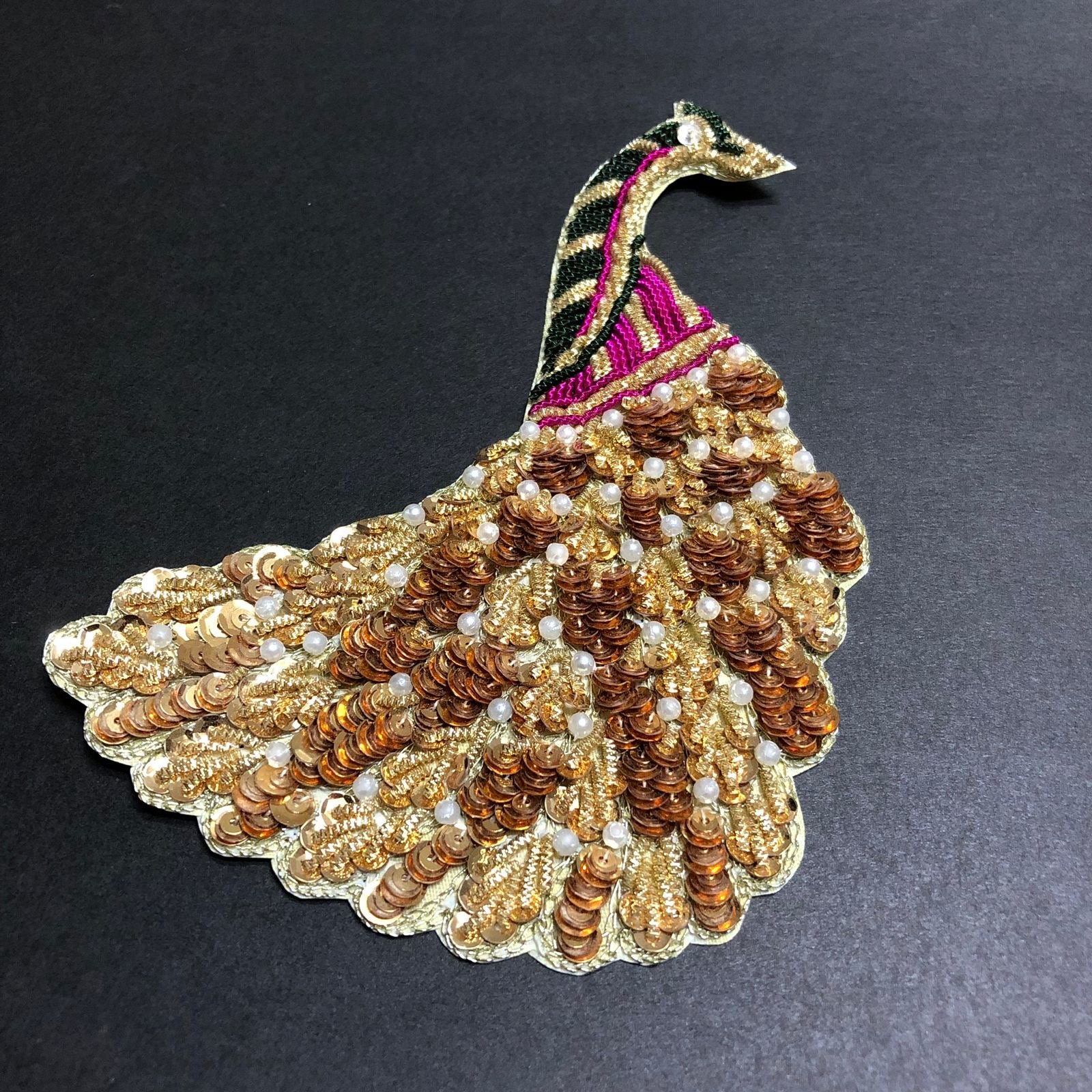 Elevate your style to regal heights with a majestic peacock-shaped bunch, meticulously crafted from gold sequins, golden, green, and pink threads, adorned with lustrous pearls. This opulent accessory mirrors the vibrant plumage of a peacock, blending rich tones and intricate detailing.