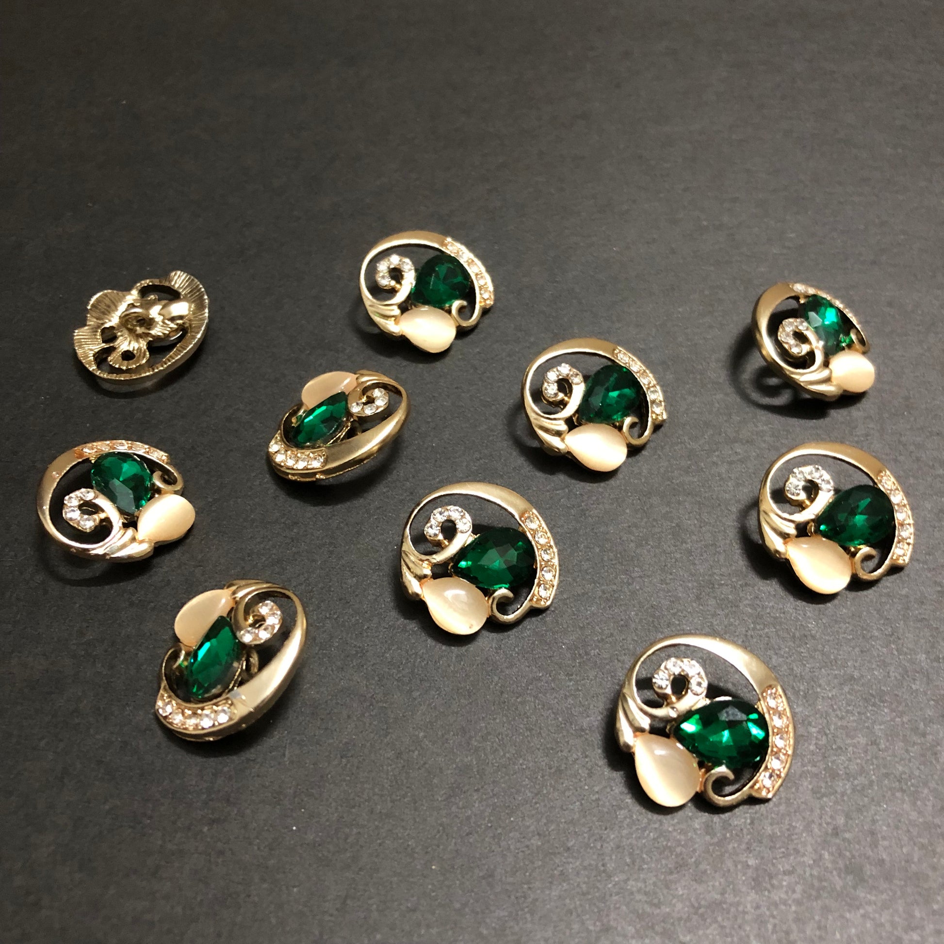 Cyclone Charms Silver Crystals with Beige Marbles and Emerald Green Stone Golden Buttons