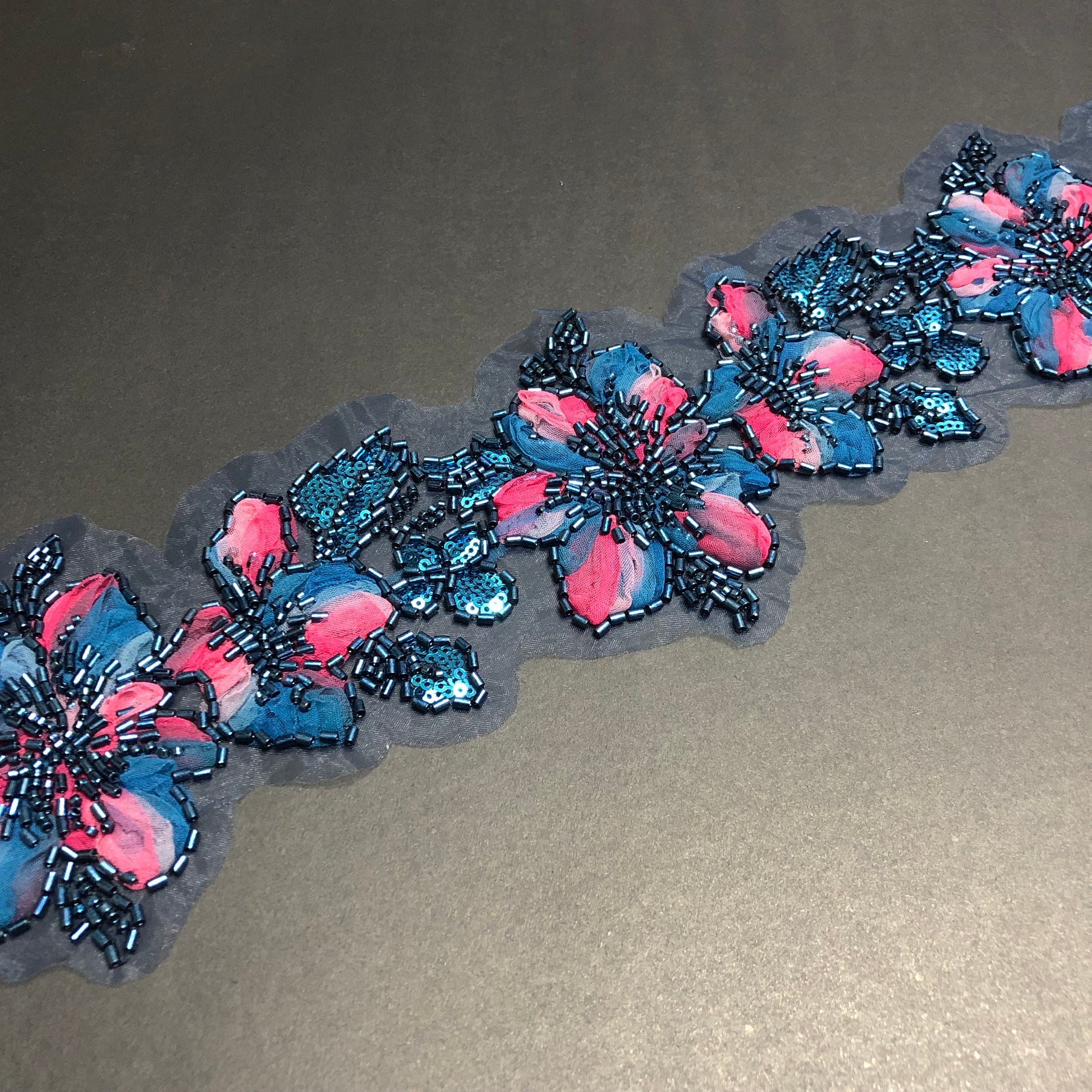 Floral Leafy Blue Sequence, Cutdana and Rose Pink Plus Blue Net Tissue Lace