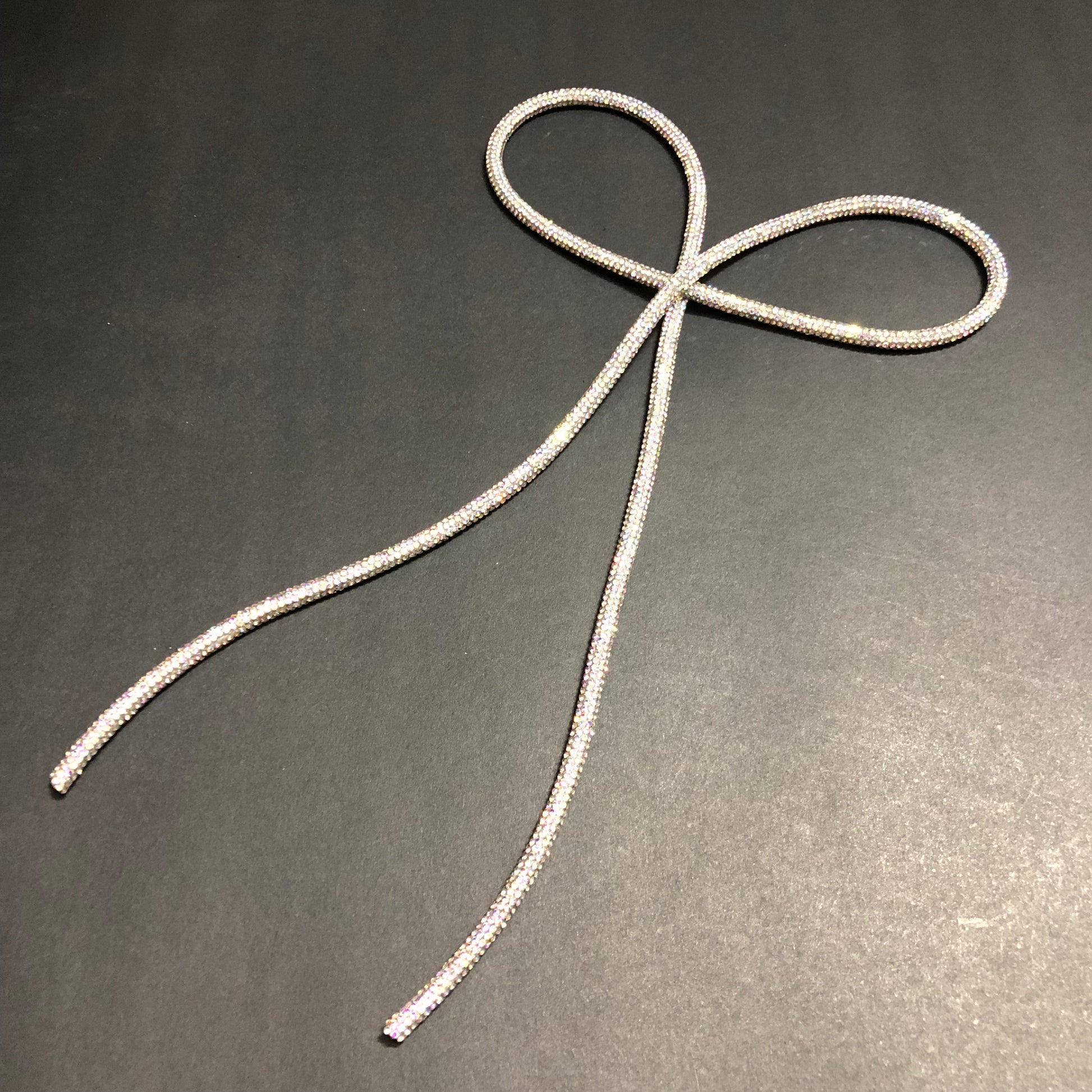 Elevate your ensemble with this stunning long bow accessory, designed to make a graceful statement. Adorned with delicate silver multi stones that shimmer with every movement, this bow is the epitome of timeless elegance and modern glamour.