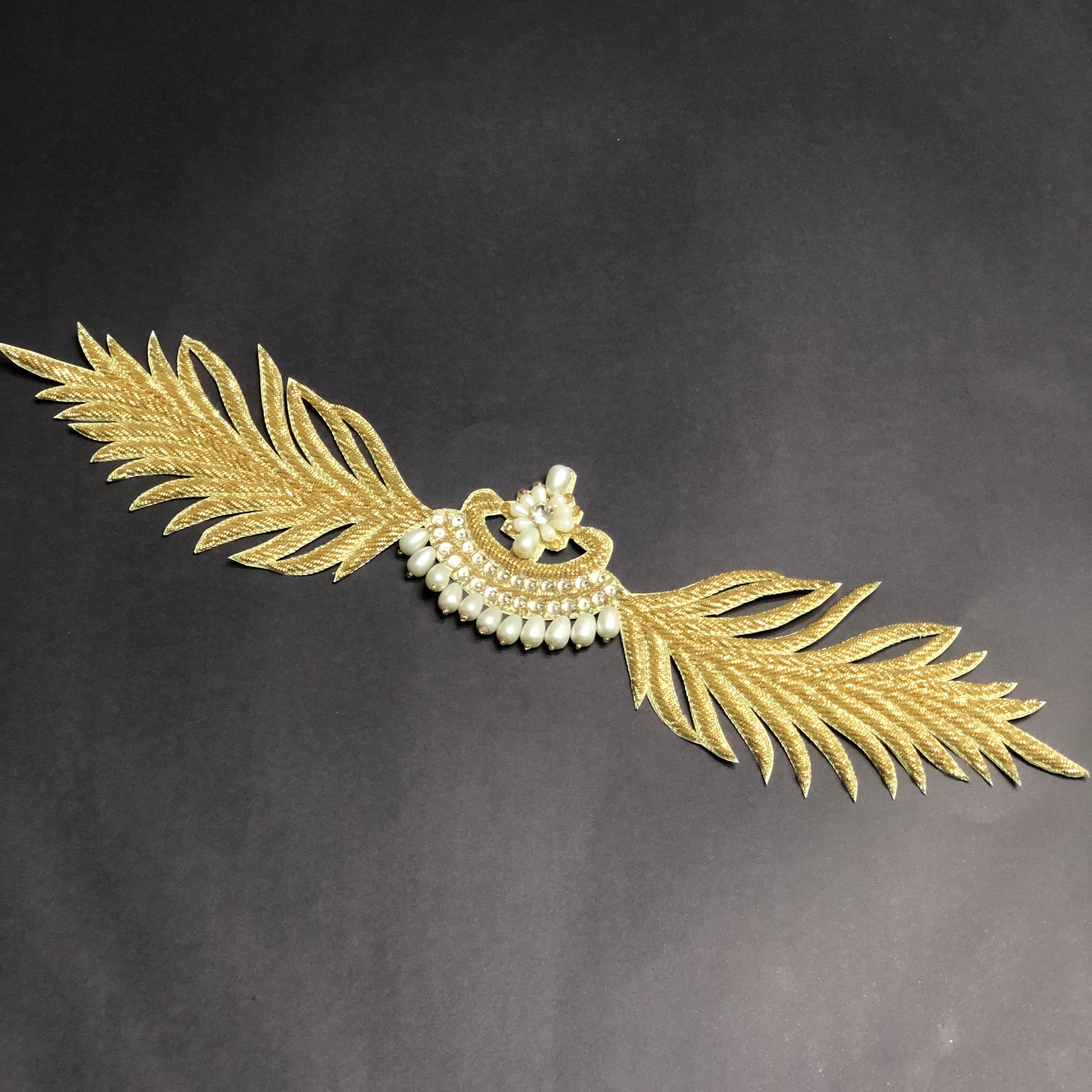 This handmade motif waist and backstripe comprises of off-white pearls beads, and golden leafy stripe a perfect article to pop up your style.