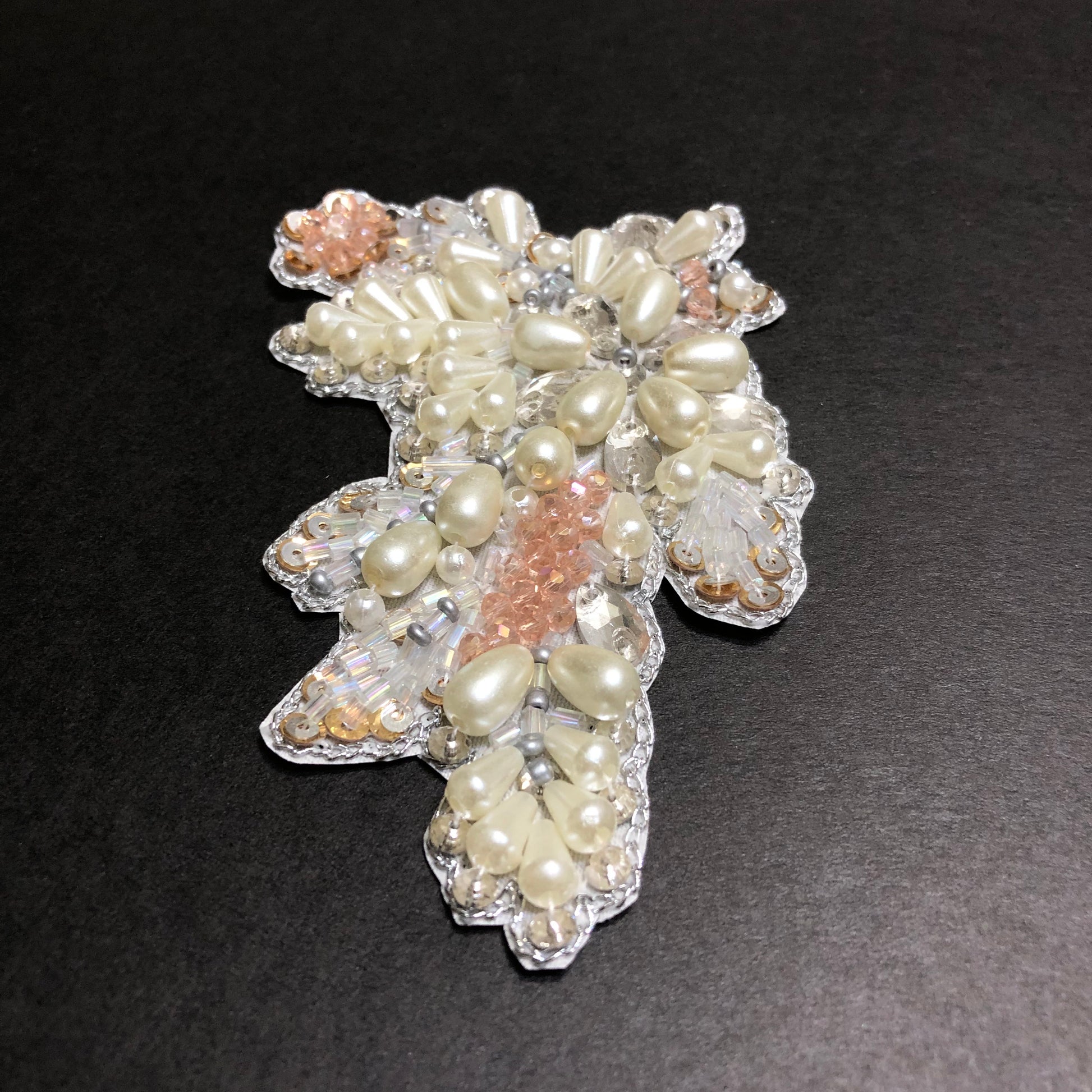 This bunch complementing the pearls and crystals are delicate blush pink beads, which infuse the design with a subtle hint of color and romance. The combination of pastel tones creates a harmonious and ethereal aesthetic, perfect for adding a touch of grace to any ensemble.