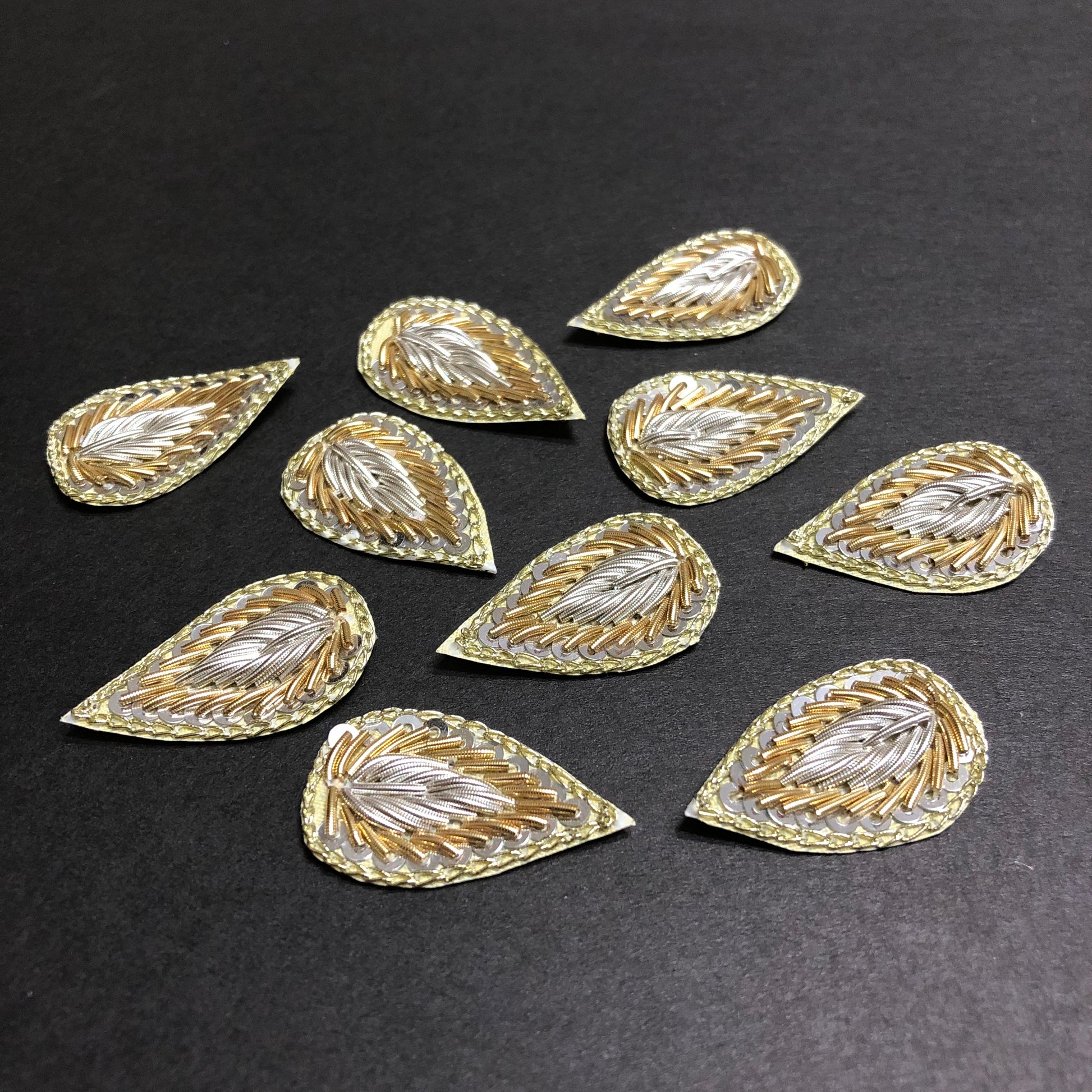 A combination of golden and silver ovate handmade bunch is a stunning arrangement of golden and silver-hued sequence that are gracefully gathered in an elongated, drop shape. This exquisite composition showcases beauty and the artistry of design, making it a remarkable centerpiece for your outfit.