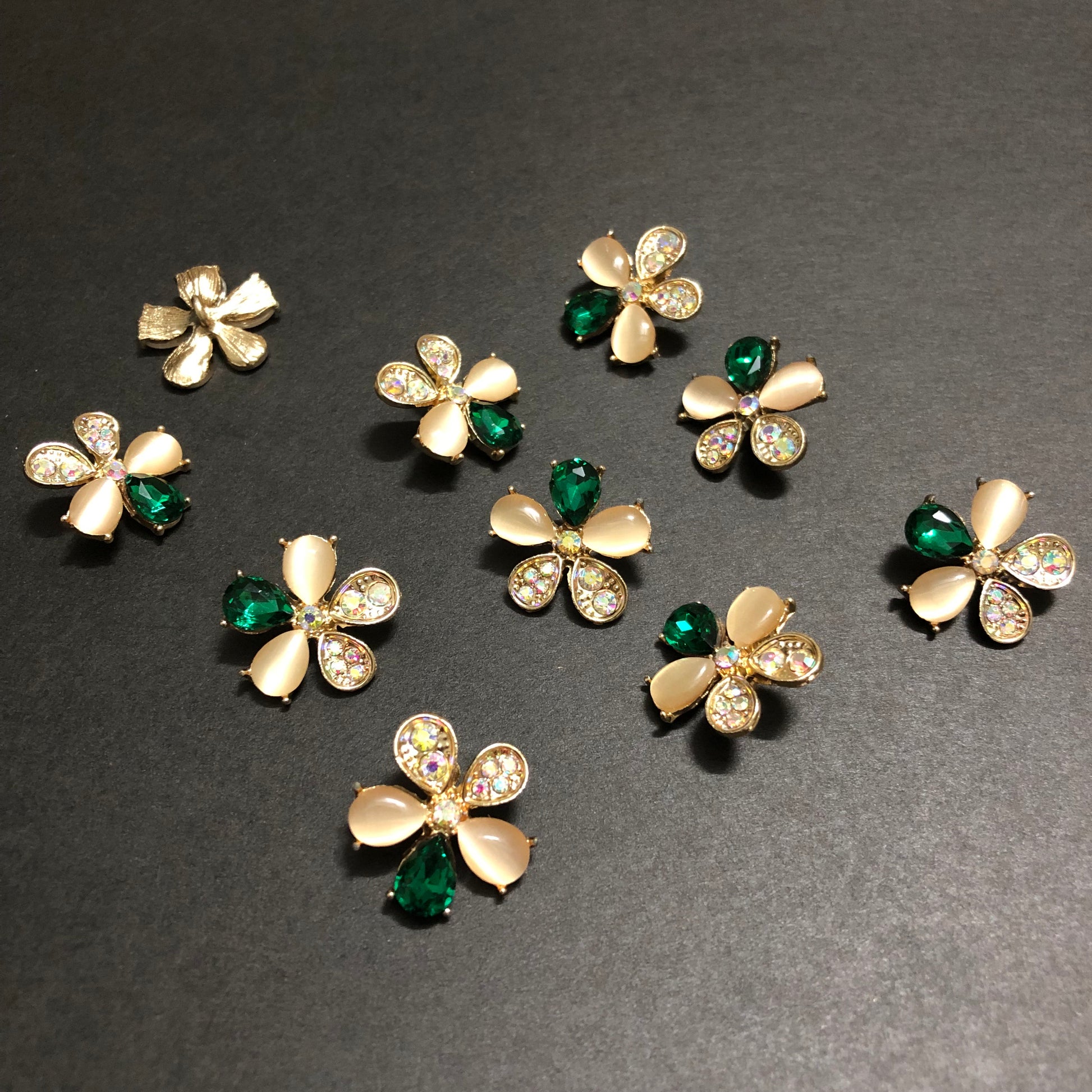 Petal Whirls Multi-Colour Crystals with Beige Marbles and Emerald Green Stone Golden Buttons