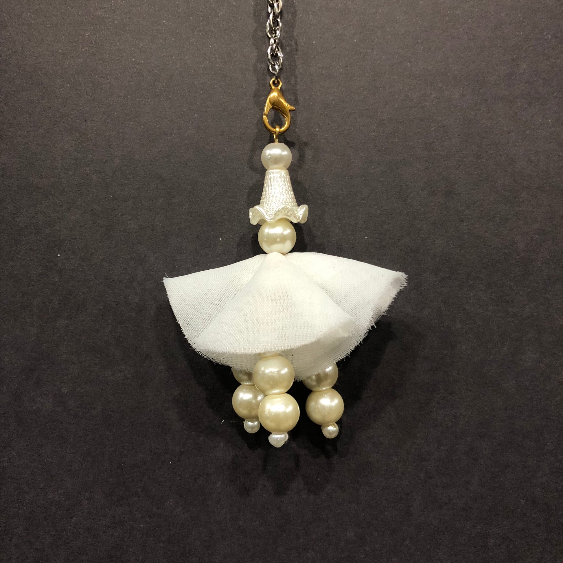 This tassel with off-white pearls and white cones attached to it makes fashion always outrageous.